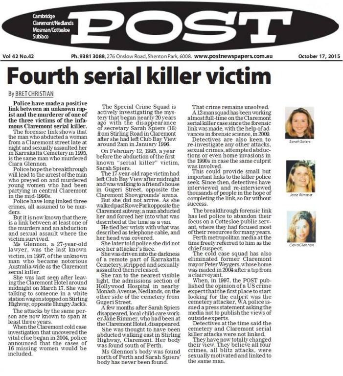 I have heard many stories over the years of indecent exposure, attempted rapes along that stretch of Leach Highway from Wilson to Bull Creek, including the "black path" that runs near Rossmoyne SHS and All Saints College. To me, it was blatantly obvious that it was more than likely the same offender who was targeting the school routes and escalating in his crimes.