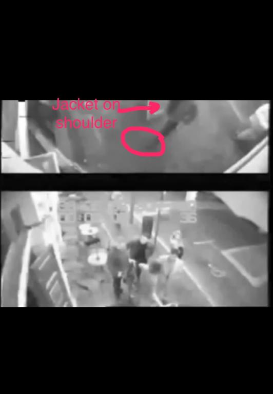 Then when I looked at the lower shot I realised that was a clearer image of the guy walking away (top half) and you can see he has a black jacket or something over his left shoulder.