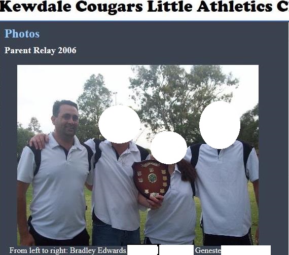 Found this pic of BE from 2006 on the Kewdale LAC website a couple of days ago (via Internet Archive Wayback Machine). He was part of a winning parent 4 x 100m relay team at some athletics meet. Looks pretty fit here and could obviously run a bit. His ex-wife CGE was in the team too (other faces / names blocked for privacy reasons). Also, I can't get back into that webpage now on the Wayback Machine (blockages in place?) and didn't screen shot the homepage but for what it's worth I noticed the club's website at that time (2006) was designed by 'Metamorphosis Design'. Was BE the website designer at that time? Interesting choice of name perhaps? (MOO)