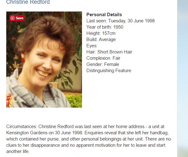 Her body was found on a walking trail in the dunes at Tennyson. She had been shot in the head and back. Susan was last seen the previous evening, getting into a white car on Port Rd, West Hindmarsh. Reward $200,000
