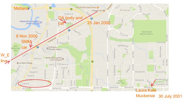 It gets incredibly complicated trying to figure it out. I've attached the map based on Spinnakers spot with the locations of bodies, or Sarah MMahan's car found in Midland. Reading SMM Inquest you can't help be convinced Donald Morey was responsible, and possibly for the others in Midland as well. The W _ E line goes no where near Pechey Car park, which is just off the right hand end of Morrison Rd on the image below. I've circled North St, Midland however, as I remember one of the alias's talking about living there. Don't know if this means anything.