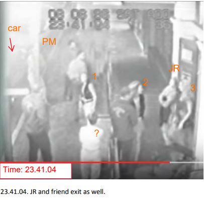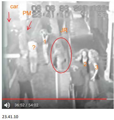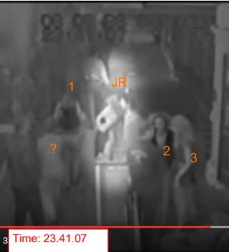 1, ?, JR are friends for sure. 1,? Have left in cab already in above footage. JR still there. 2 has nothing to do with them & is still there. 3 or another unknown is 4th friend also gone with 1, ?. Thats how I see it. No.idea why theres no footage of them at all returning. Could they possibly have jagged walking back totally unseen in the exact 50secs the footage goes to cameras 3/4 inside? Seems a little .. shall we say strange!!