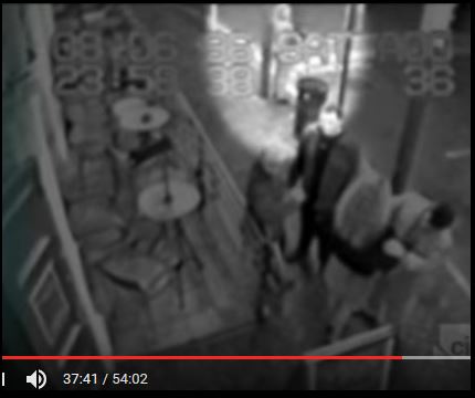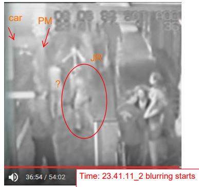 Blurring of image starts at 23.41.11. Next frame doco is 23.41.38? Looks like Time stamp on cctv has been changed, or interfered with so I think it is .38 The short black panted and black top girl in background is only there fo two frames then she becomes a he, and time jumps 20 seconds, IMO