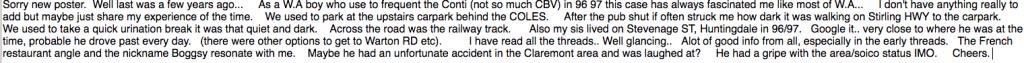 *Sorry new poster. Well last was a few years ago. As a W.A boy who used to frequent the Conti (not so much CBV) in 96 and 97 this case has always fascinated me like most of W.A. I don't have much to add, other than share my experience of the time.