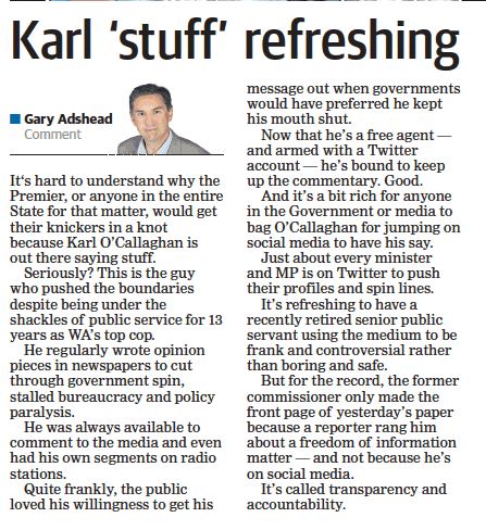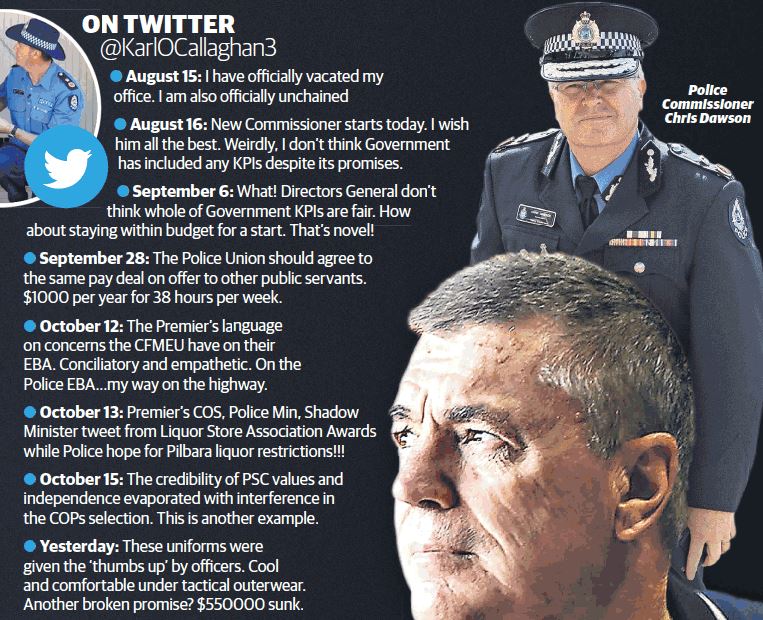 [FONT=&amp]Mr O’Callaghan raised the matter again with Premier Mark McGowan and Police Minister Michelle Roberts after Labor was elected in March and set about recruiting a new police commissioner....