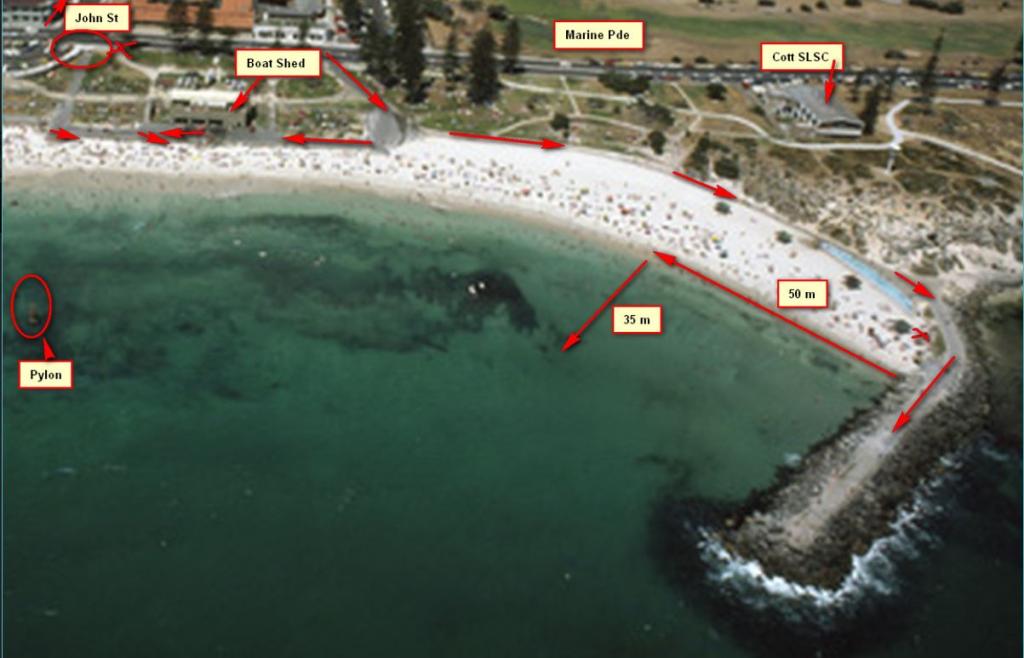 Cottesloe Beach Pylon Part 1: Years ago swimmers could climb up onto the pylon and then dive off. This activity has been banned for years due to danger and liability issues.