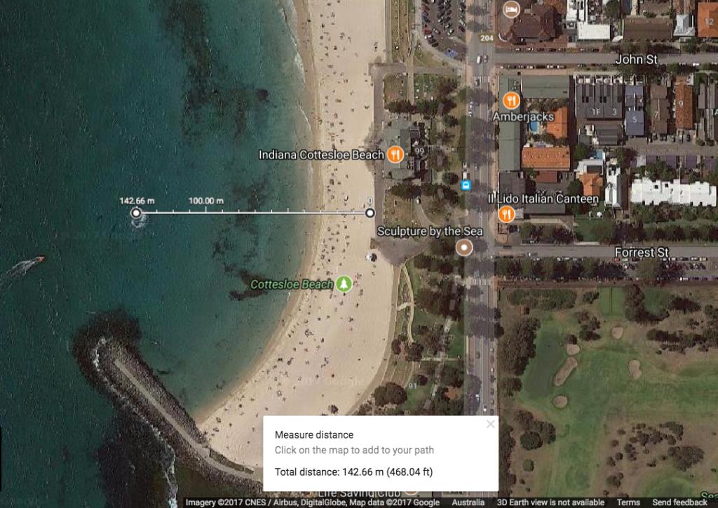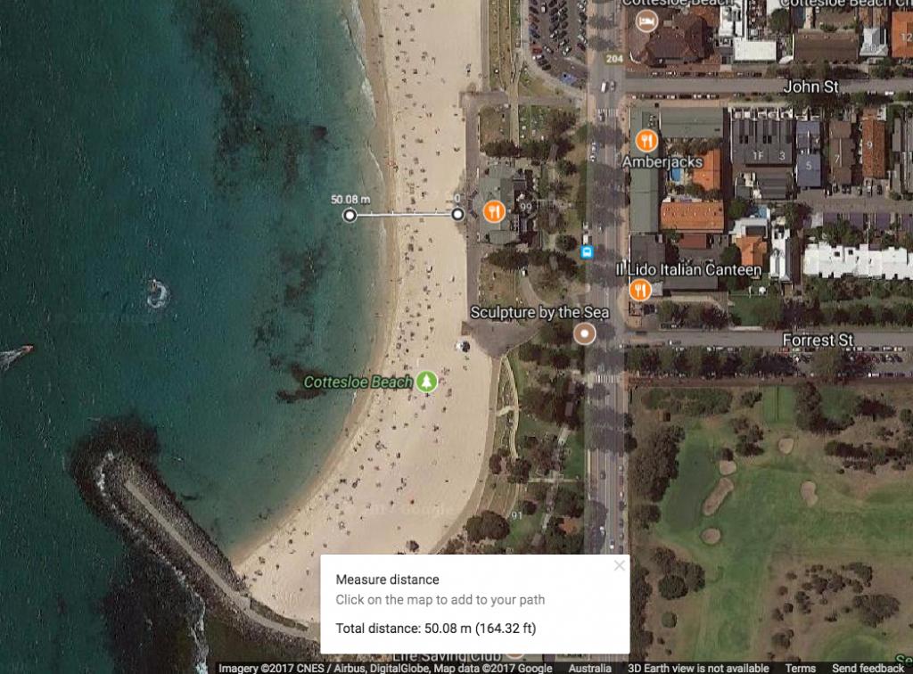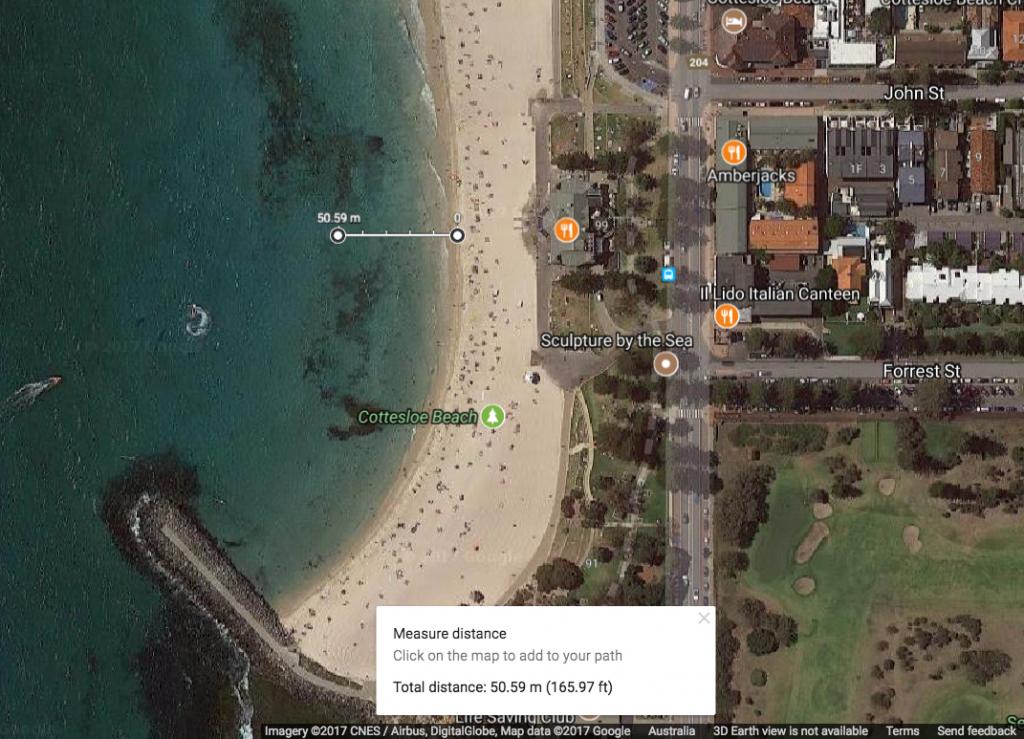 JC car BLF: Here's some Google Maps screen shots illustrating the distance of 50m that MSM reports as the distance BLF found off the beach. I acknowledge that there are mixed reports of whether BLF was found to be 35m or 50m out from the beach, but I'm assuming you can all guess what 35m looks like given the 50m distance.