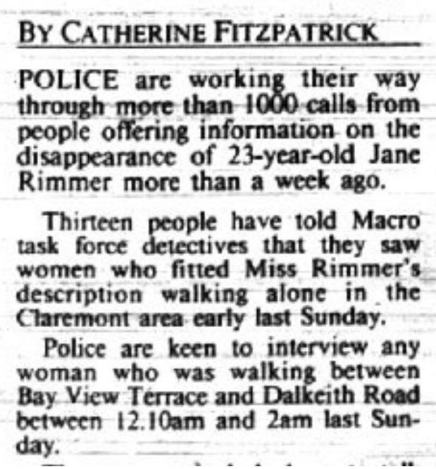 Source: Perth newspaper more than a week after Jane Rimmer disappeared (16 -17 June 1988?)