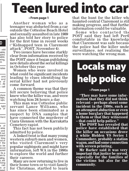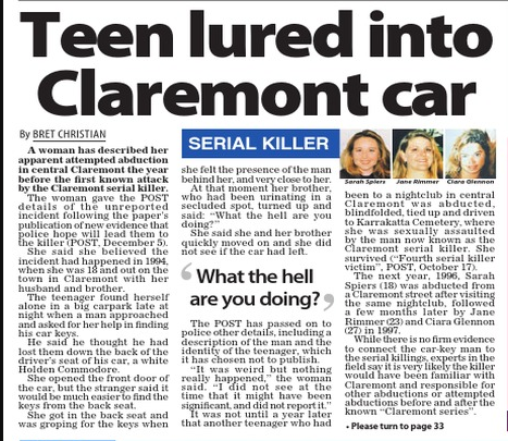 Post Newspaper 14Nov15 "Kidnapped teen in Claremont attack". Bret Christian.