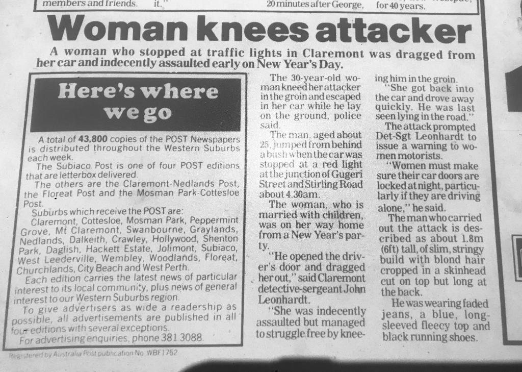 When I think of Claremont back in the day....it was dimly lit, very few people or cars around, lots of dark alleys & lanes, loads of bush areas within a few km radius etc. I can see how easily those poor women could have been taken from the street. As awful as it was to watch....thanks for posting PD