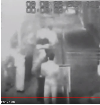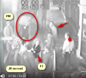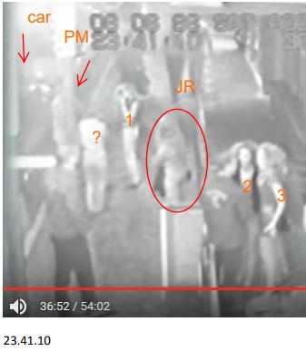 Three patrons look to hail a taxi. Yellow arrow pointing a guy with arm out. Headlight shine on them and Jane in the background circled in red. Note girl in long skirt in the group of three. Second image added for timestamp. Source:You tube Flect cctv Jane Rimmer