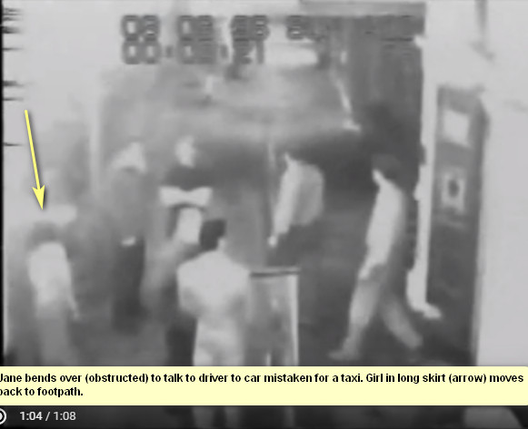 In this image Jane is circled in red next to pole and three patrons have moved to road to get in taxi. ONe of them is bending over in this image I think. They move back to the footpath where the girl in the long skirt is pointed out in the yellow arrow.
