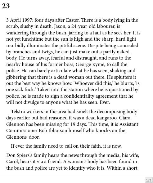 One question which could be raised is why was CG left close to houses when there was open areas left to leave her? Also was there a reason CG was left close to Telstra workforce?