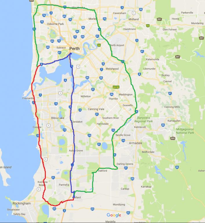 Red - route through Freo, Cockburn Rd, Mandurah Rd, Wellard Rd