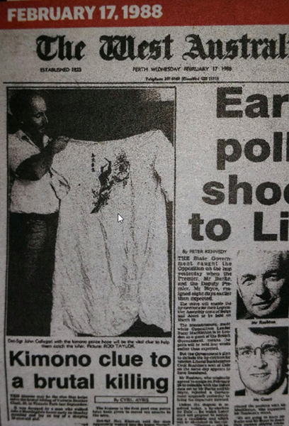 The kimono was shown in the paper (about 1988). At the time, the police thought it was in relation to a murder in Leonard St, Victoria Park, but another perpetrator was imprisoned for that crime.