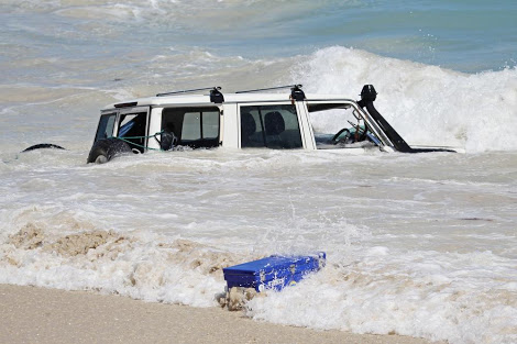 Surf was heavy and the 4WD I have it on good authority that it remained in the wave zone for 2 hours before being removed by professional tow. Body and windows of car seem OK from force of waves, before being towed out.