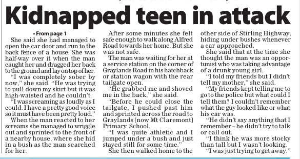 Heres the article about the women dragged from her car and let out on "Centenary Rd Wilson" for starters. I couldnt get a clear shot of the first part of the article but what you can see tells her terrifying story completely IMO.