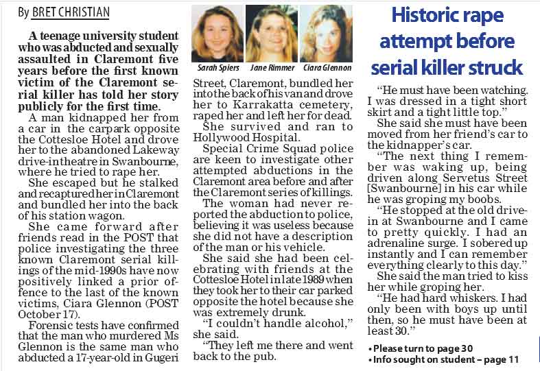 There has been some debate in relation to the 1989 Cottesloe abduction/ Lakeside Drive-In abductions as to whether BRE was responsible due to the comment in the article that "He had hard whiskers. I had only been with boys up until then, so he must have been at least 30".