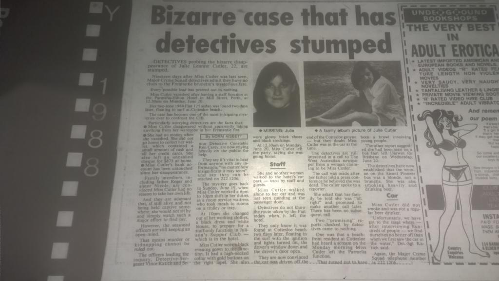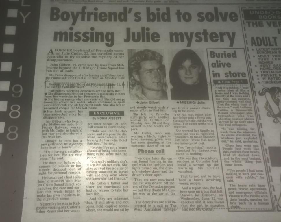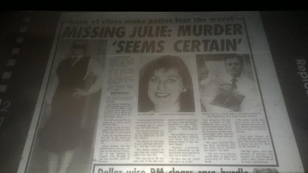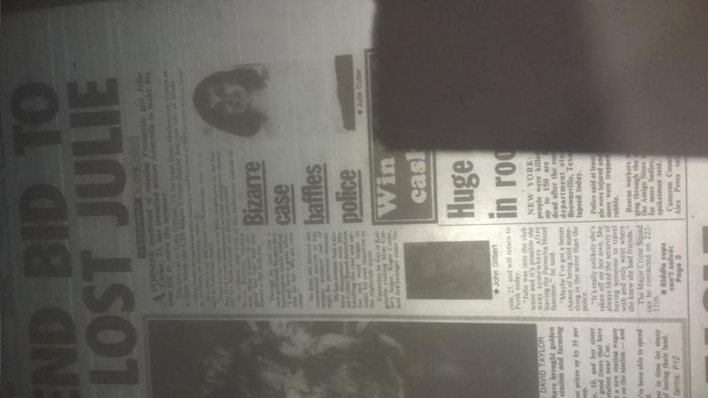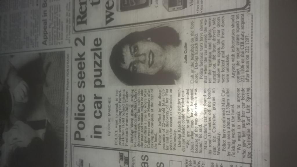 The missing items puzzle was examined by major crime squad Detective Snr Constable Ron Carey, who is working on the case with Det-Sgt Vince Katich. He said they were anxious for any information about the bag and clothes. They hope their recovery will help establish Julie’s movements. The light-brown leather shoulder bag was about 30cm long and about 22cm deep, it had a ??something?? over flap. The clothing items were the white blouse and black skirt worn in her job at the Parmelia. These were in a white plastic bag. Julie had changed out of the clothes at 10pm on Sunday June 10 when she finished work in the hotel and prepared for the staff-only party in the hotel night-club.
