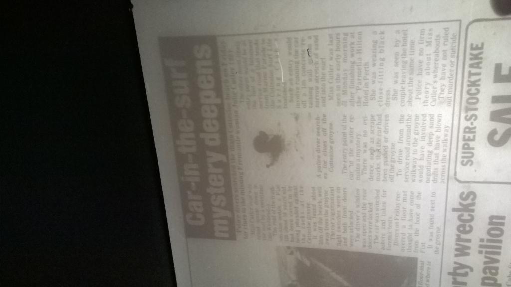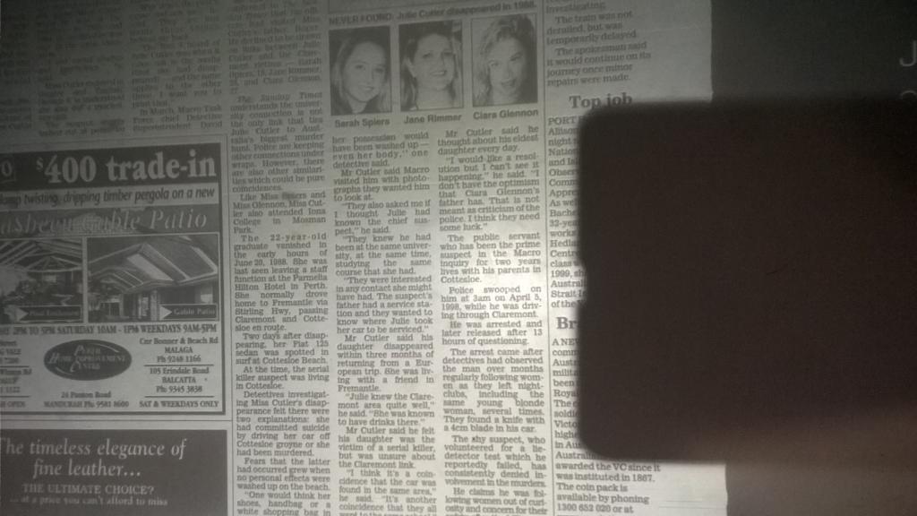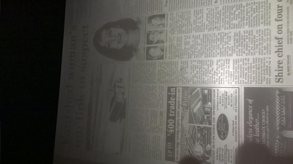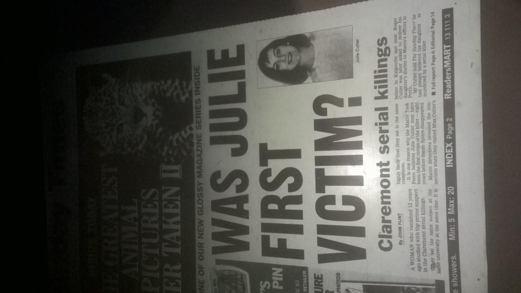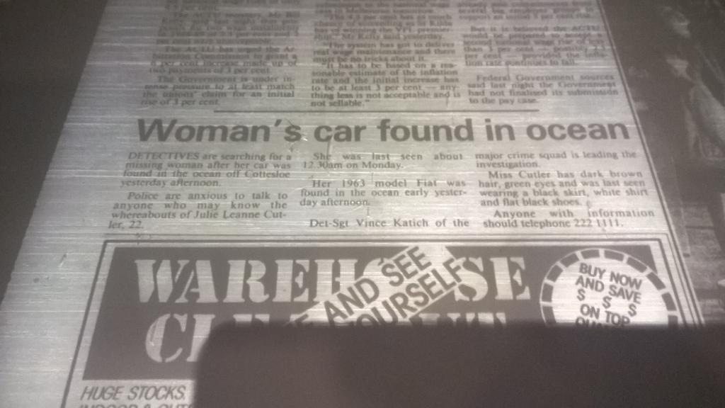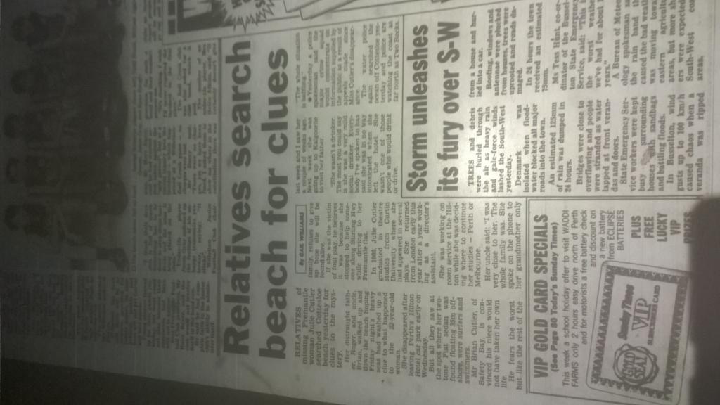 The missing items puzzle was examined by major crime squad Detective Snr Constable Ron Carey, who is working on the case with Det-Sgt Vince Katich. He said they were anxious for any information about the bag and clothes. They hope their recovery will help establish Julie’s movements. The light-brown leather shoulder bag was about 30cm long and about 22cm deep, it had a ??something?? over flap. The clothing items were the white blouse and black skirt worn in her job at the Parmelia. These were in a white plastic bag. Julie had changed out of the clothes at 10pm on Sunday June 10 when she finished work in the hotel and prepared for the staff-only party in the hotel night-club.