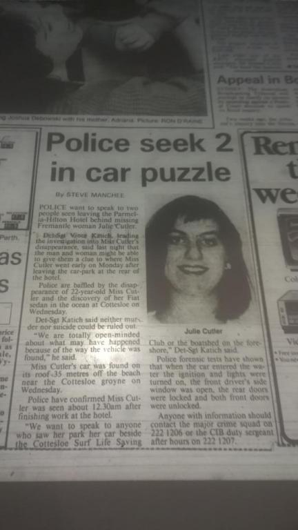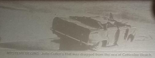 This article posted by no name says that "Miss Cutlers car was found on its roof, 35m off the beach near the Cottesloe groyne".