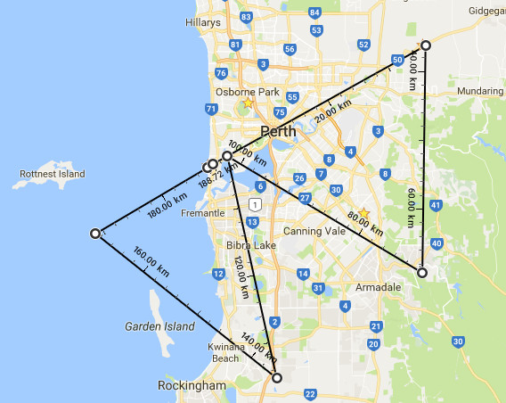 if you connect the dots between Red Hill Auditorium and Challenger Parade Madora Bay, the lines intersects (almost) with JR's d-site AND 10 Huntingdale Road. Same line is stones throw from Gay St house.