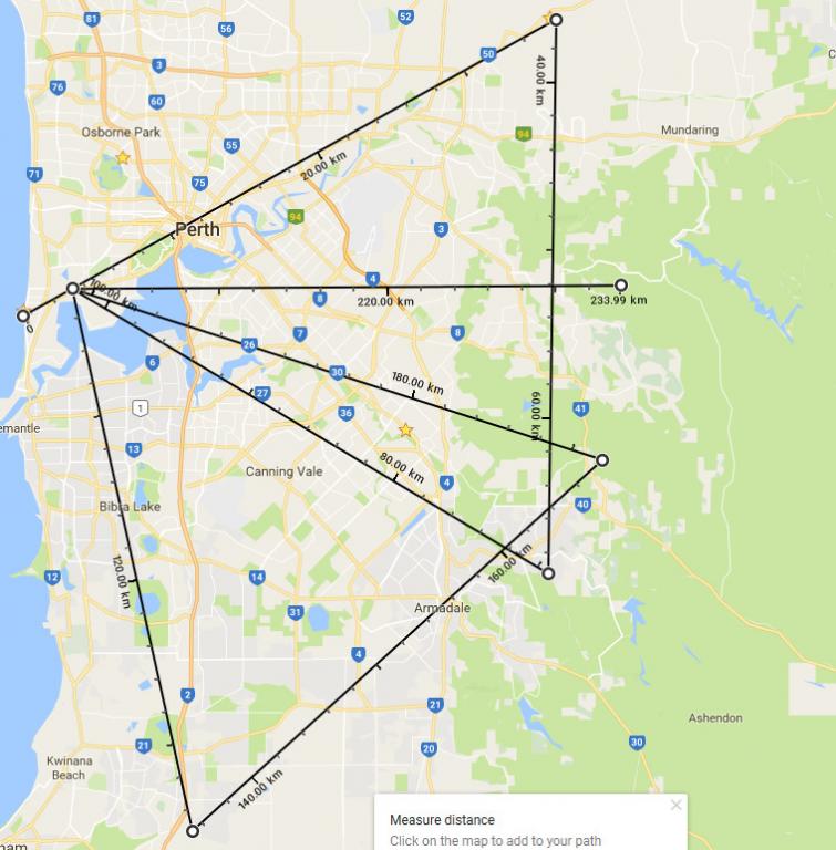 I’ve also used this Red Hill Auditorium point as a directional marker for startrek and star patterns with all sides 78.4m long, the distance between which I'll post another time.