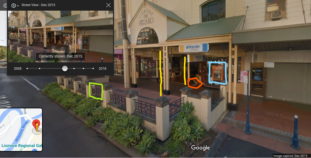 Below is a screenshot of the ATM at the Greater Building Society ("Greater Bank" since 2016) in Molesworth Street Lismore at the entrance to the Strand Arcade, as shown in Google Maps Street View in December 2015. I've marked up the image to show the parts which match the ATM's CCTV of Ellen as captured on 11 September 2015: