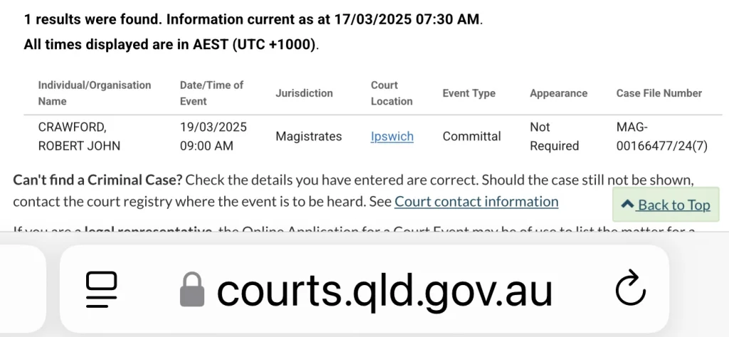 Crawford was charged on October 11 after an in-depth investigation by police and has remained in custody at Arthur Gorrie Correctional Centre since.