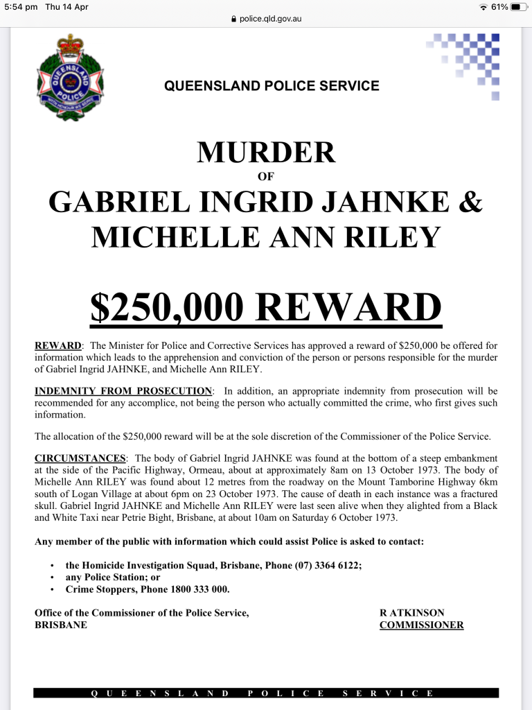 REWARD: The Minister for Police and Corrective Services has approved a reward of $250,000 be offered for information which leads to the apprehension and conviction of the person or persons responsible for the murder of Gabriel Ingrid JAHNKE, and Michelle Ann RILEY.