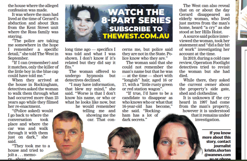 In 2019, The West Australian released an eight-part investigative documentary The Boy in the Blue Cap: The Gerard Ross Story, which is now available on The Nightly.