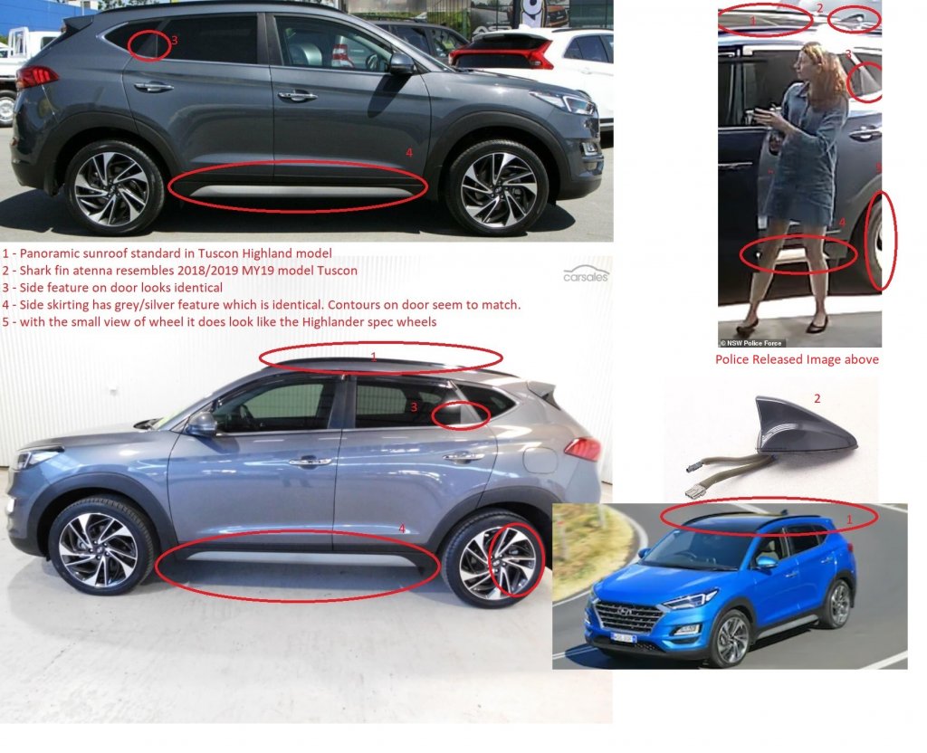 If not an uber (or similar ride service), then someone she knows drove her around that hot sunny day. Someone she is comfortable with where she doesn't bother to wear a face mask in the car. That someone either rented or owns a micron grey Hyundai Tucson Highlander badged model^^. In the police released photo, it certainly looks like the top of the range 2018, 2019 or 2020 model Hyundai Tucson.