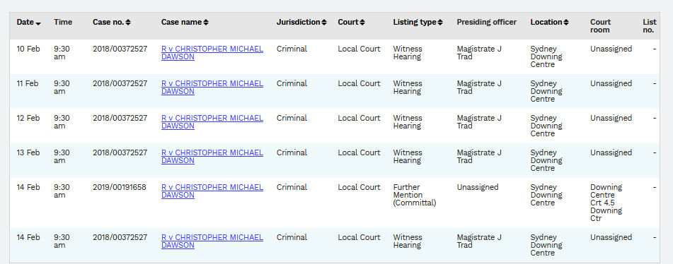 The next court dates are as follows from the lawlink registry for the NSW government. The last few court dates publicised there has been no news online that I have seen.