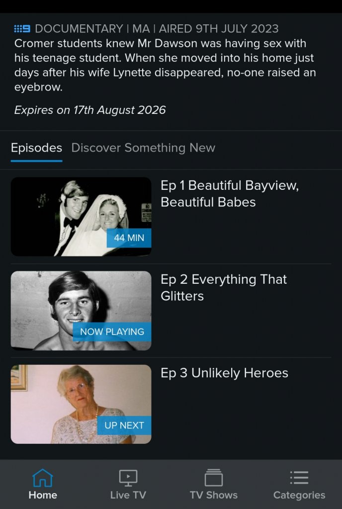 Hi K-mac, Advertised in all week, on channel 9,Melbourne... saw all episode same as tonight. The first episode Nothing special, second episode last week. About the poor girls been used and Sexually assaulted by Teachers, that's horrific? and feel for those poor girls...sad. And still paul dawson not charged, must have friends in high places.Did anybody realise there is another part to the lyn dawson story on 9 tonight?