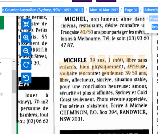 Definitely same woman- strange though it is advertised for the attention of a French town and the P.O Box is in Australia. The 2 locations in Australia, would also suggest this is someone who travels a lot and has no fixed abode as such. Cheminon is coming up with nothing even on Ancestry. I wonder if this is a pseudonym last name. I suppose it is something you might consider if you did not want people you knew who might read the local paper to know you were turning to the personals to find someone. Back then it carried a bit of a taboo I think and people felt embarrassed for others to know they turned to advertising to find someone.