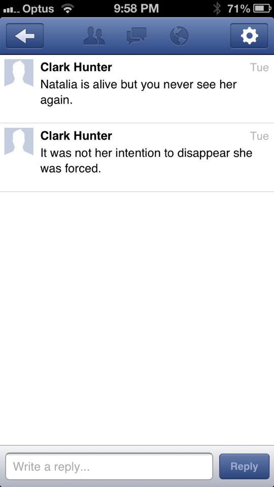 The Clark Hunter message sent to the Missing Person Marion Barter fb page run by Sally on 23 July 2013.