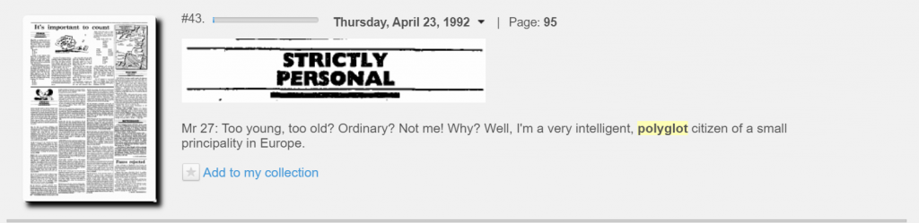 Oooh, a couple of fabulously intersting finds there KiwiNZ ... drats, I'm not a subscriber so can't help out, sorry .... but, "polyglot" and "small principality of Europe" - and that number, wowee