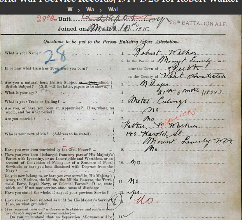 I'm Confuseled ;) The electoral roll screenshots I posted earlier do have ECW at the same address as RPW ? I can't find a census yet for Western Australia for 1921 or 31 though. Pretty sure RPW was born in Perth, his father is eluding me right now. According to the same voters roll as I posted before, parents, Frederick and Ann lived at the address Robert put for next of kin on enlistment form so they all fit....somehow