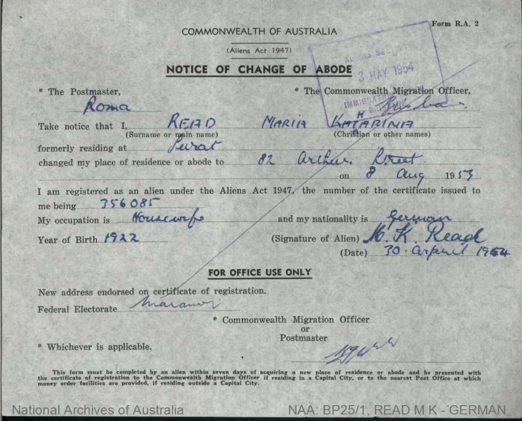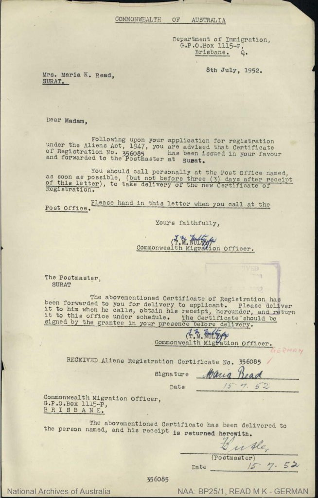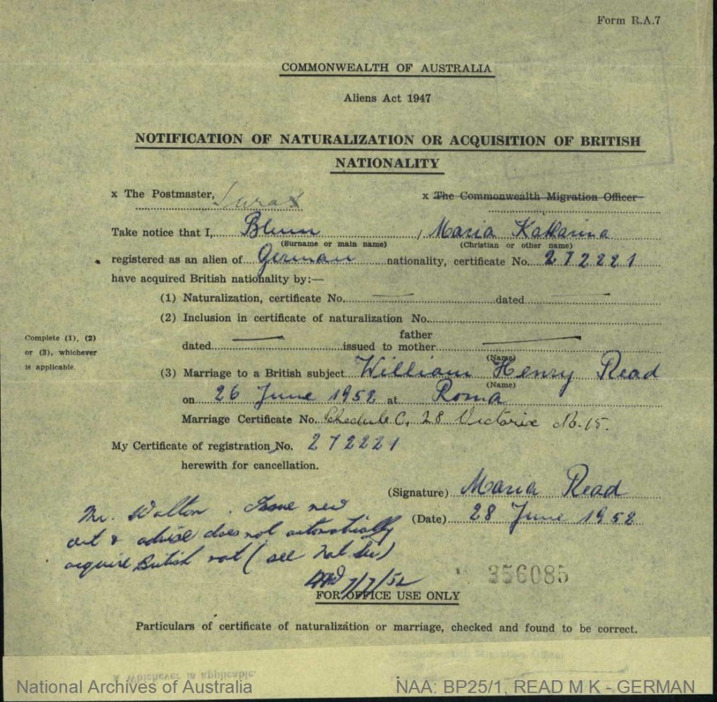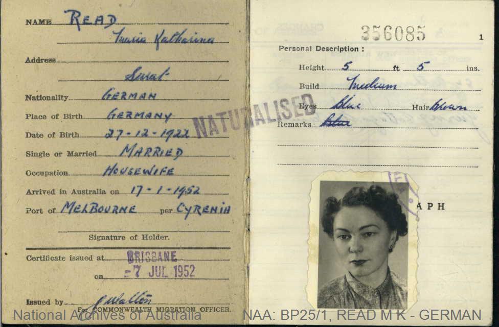 Naturalised 7 July 1952 ( states now married housewife living in Surat) Maria R Read