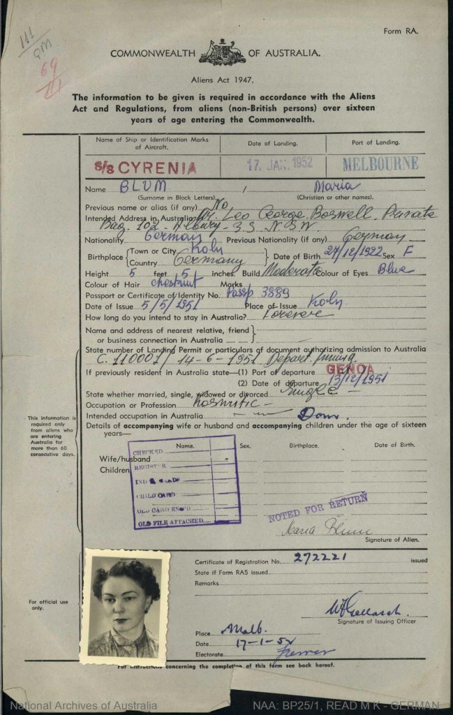 arrived Aust 17 Jan 1952 melbourne
