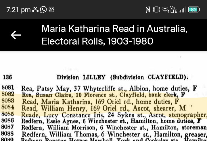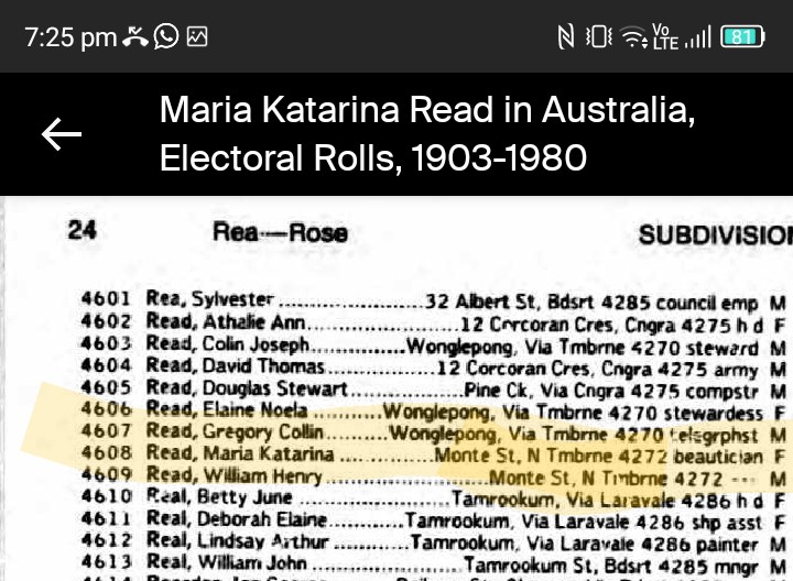 Maria Katarina Read with her Shearer husband on electoral roles with a few other addresses in Queensland. It must have been a lonely time for a Shearers wife during shearing season. she is listed as a Kosmetiks on her docs and Beautician on electoral roll. What a beautiful looking lady she was. Maria must have known the Tamborine community in Monte st. Geissmann family being very well known in Monte st. What a great lot of info you have . :) I'm trying to find obituaries for the Reads.