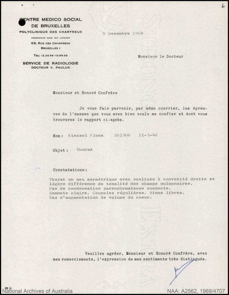 RE Thorax: it wasn’t me who mentioned it before but I saw reference to scoliosis in the thorax region on the X-ray report for IK’s application for migration (ref NAA p14 & 17). The report is written in French, but notes this “slight” scoliosis and also notably no enlargement or problem with the heart (I know the myocardial cause of death was 10 years later but just thought I would note that).