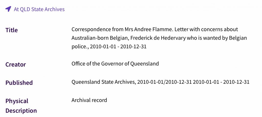 Re: Andree Flamme. I just noticed that the Queensland Government's Archival coversheet has incorrectly recorded FdH as an "Australian-born Belgian" when it should have been the other way around. Could this be a reason her letter of complant was not properly researched? The Australian authorities response could have been that "It's out of our jurisdiction and not our problem because he is now a BELGIAN CITIZEN (not living in Australia), where the fraud/theft occurred.