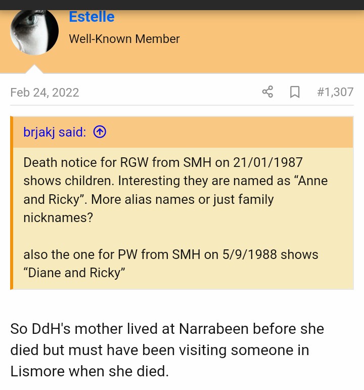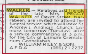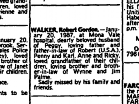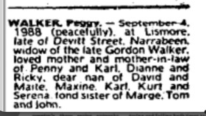 Mmmmm? Father (Robert W) died the year before. Mother 'Peggy' Walker dies the following year in Lismore Hosp! DdH inherits from her mother & builds a house????