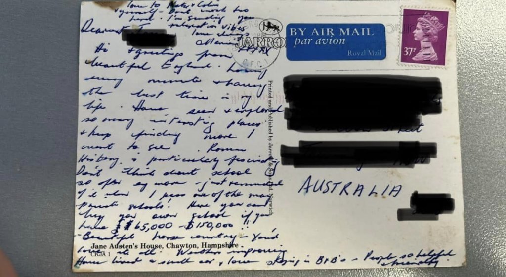 The postcard talks about “pass one of the many private schools!” before she then mentions the cost which appears to be a undervaluation in 1997.