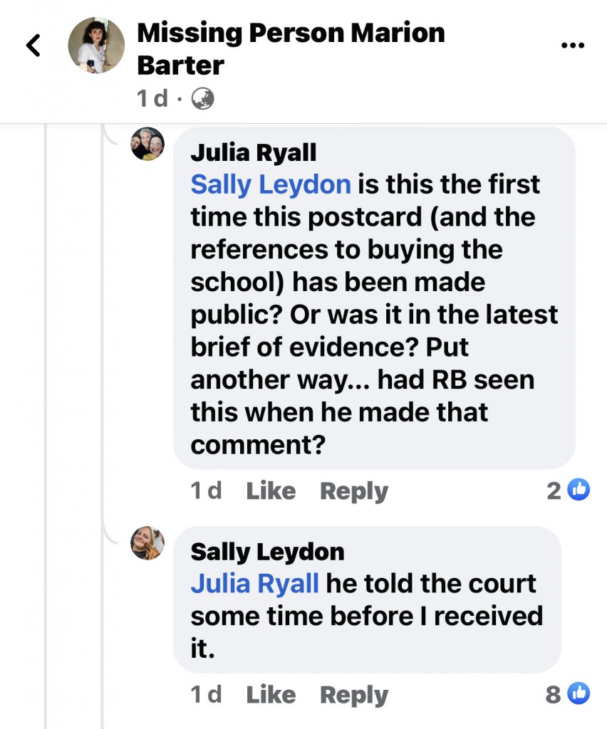 Well, yes, AKA read the brief, but pieces of evidence keep getting added. Apparently he made the statement about Marion buying the school BEFORE the postcard was added. See comment by SL on the MPMB FB post.
