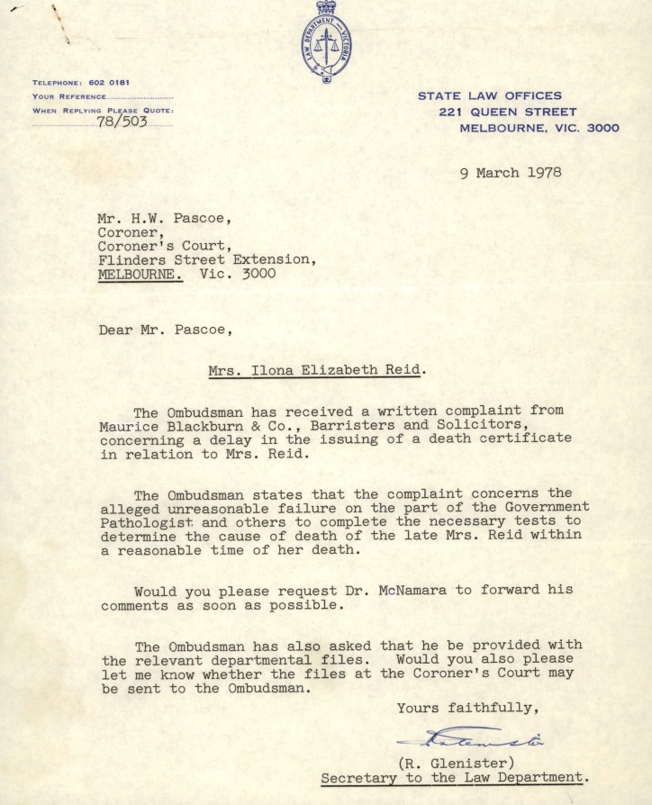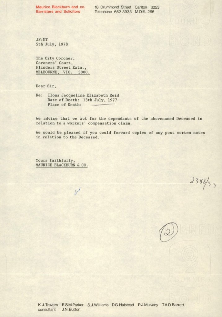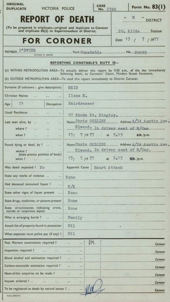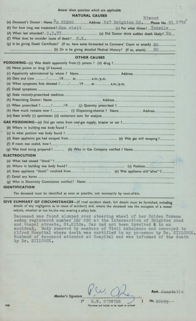 From her report I can see she had only seen her Jewish doctor a few days before, on the 7 July for tonsillitis. It was midweek when she died and after work at Beales Hairdressers in Hawthorn. But instead of heading toward Dingley where she lived at the time, she was headed toward Elwood, where her Drs surgery was a few minutes away, or maybe she was going to her friends who also lived at Elwood..