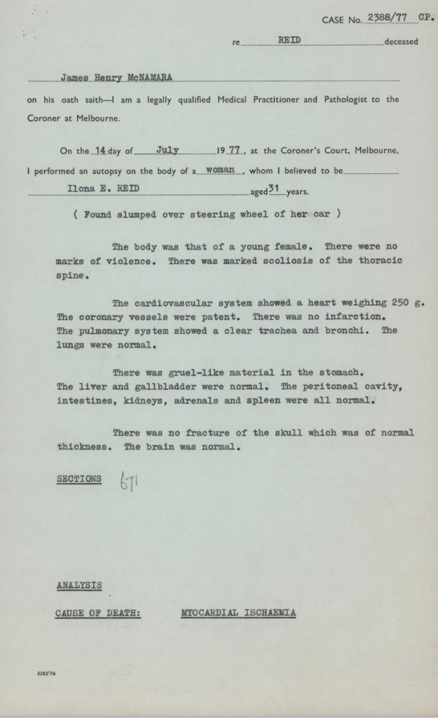 Autopsy report - 14 July - no marks of violence, marked scoliosis of the theoretic spine (as also stated per her entry form into Aust 1969), with "gruel like " material in stomach, all organs, heart etc were normal.