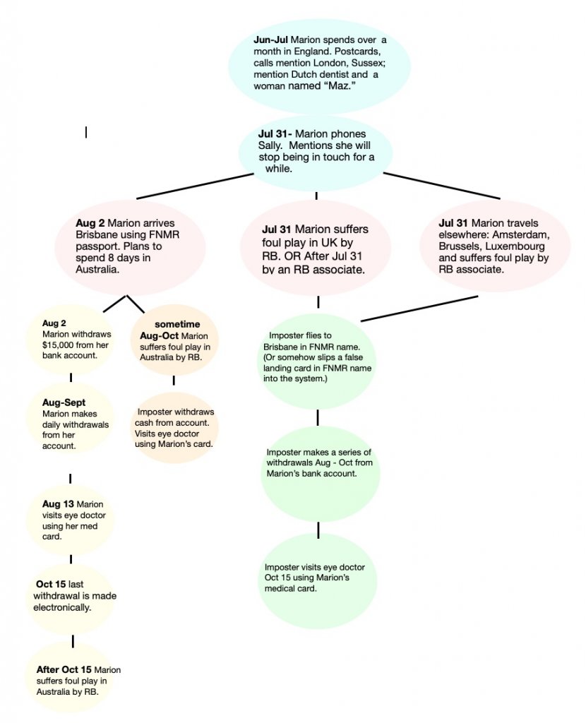 Sally's post on FB 15Jun had info on the postmarks of the postcards and letter from Marion, decoded for when processed etc. There is no mention on SL's post of any outstanding anomalies such as cards processed a month after MB's return to Aus, so I had thought the scenario of someone else sending cards had been discounted. JMO