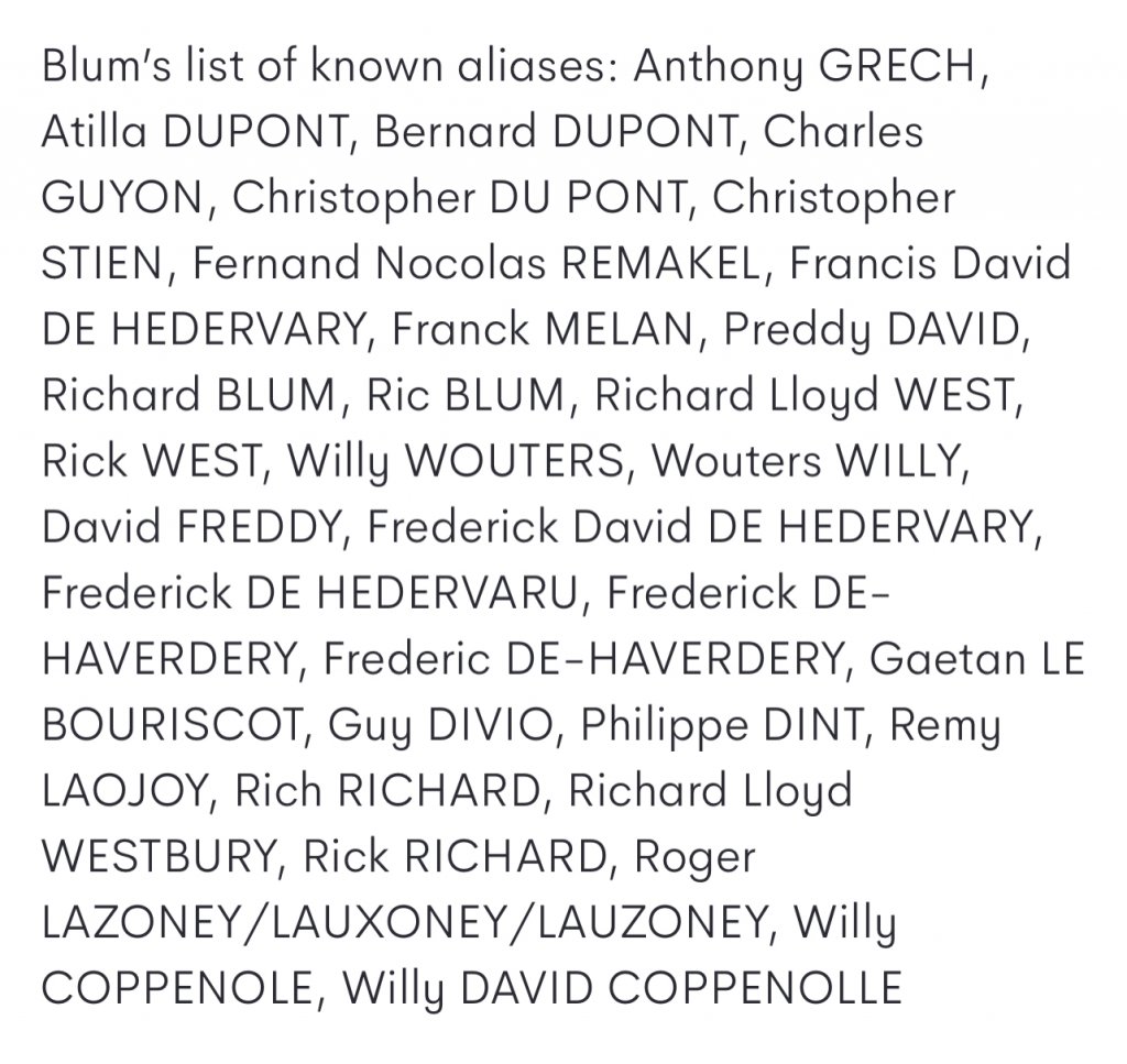 One of his aliases is ATILLA DUPONT. Here’s a fairly recent update of his various identities.